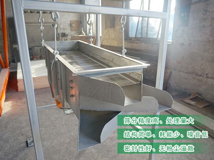 整個(gè)設(shè)備由篩箱、網(wǎng)架、篩網(wǎng)、2臺(tái)臥式振動(dòng)篩電機(jī)、減震彈簧、進(jìn)出料口、上蓋組成,除此之外還有高度可按需求定制的支架通過四個(gè)吊鉤把整個(gè)設(shè)備吊掛起來使其處于懸空狀態(tài)。